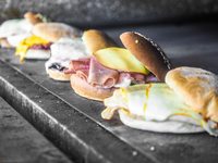 Wild mushrooms, gorgonzola cheese, and horseradish mayonnaise on ciabatta bread.